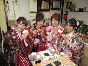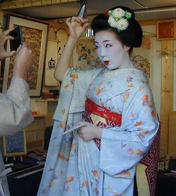 上七軒の舞妓・梅智賀さんが当店で糸枠かんざしを付けているところです。