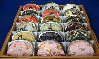 二坪程のミニ店舗ですが、こだわりを持って、西陣織の裂地と道具を使って創作した
